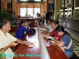 The interior design of the building was really wonderful and it was well preserved. The picture of Ho Chi Minh was hanging high on the wall and whoever walked into the building could easily spot. Those old design of telephone booths were on the two sides of the lobby, with two huge old maps hanging high on the wall above them. Before reaching the rows of servicing counters, there was a souvenir counter in the middle selling postcards, books, envelopes, etc. They were selling variety of different designs of postcards about the scenery, buildings and people of Vietnam and the price was reasonably cheap. I bought quite a lot of postcards there. Friends of mine even wrote and posted some postcards to their friends back home. There were few long wooden tables and benches for anybody who would like to rest or write letters there.